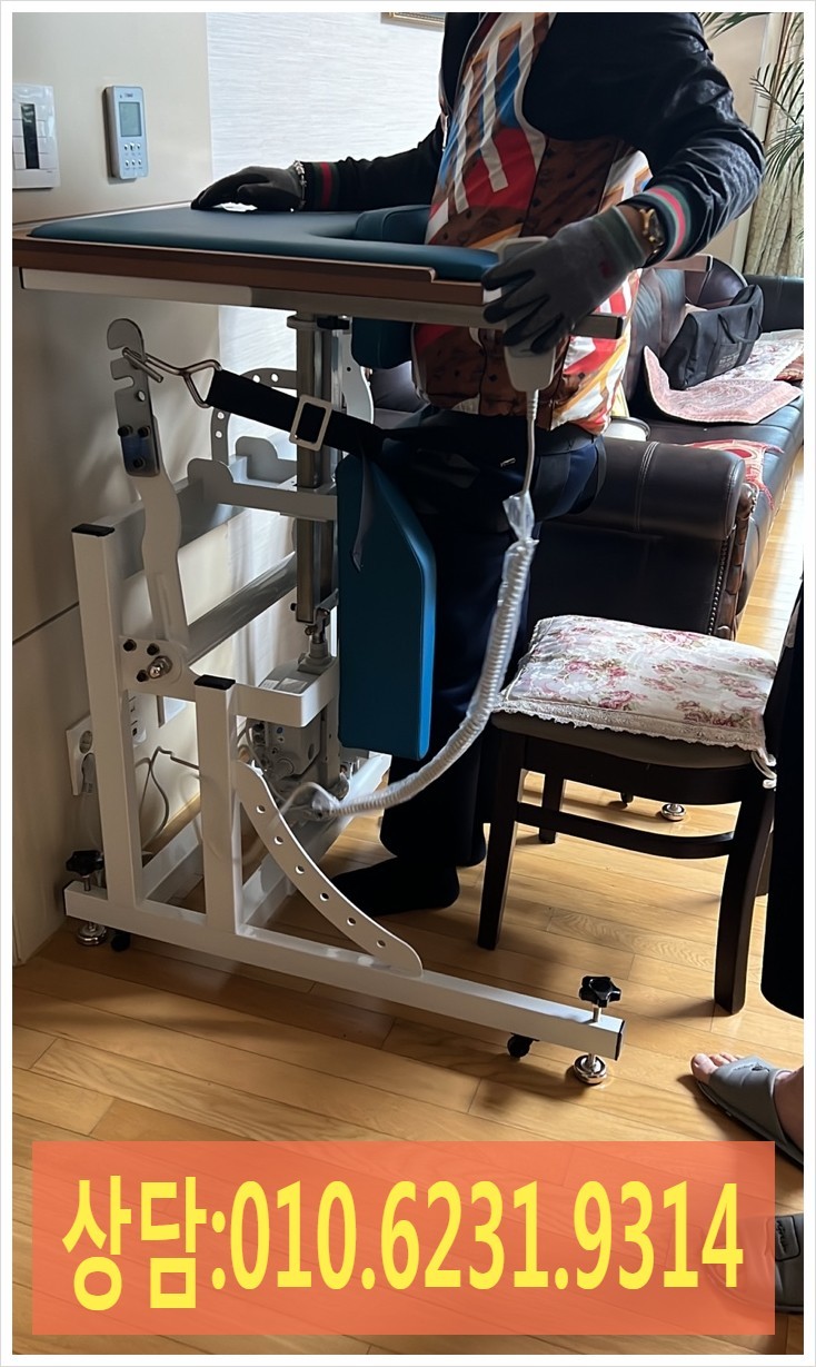 바로서기운동기는 휠체어에서 엉덩이벨트를 사용하여 바로설수있도록 사용하는 제품이며 상판의 높낮이또한 전동을 이용하여 리모콘 조작으로 손쉅게 사용이 가능합니다